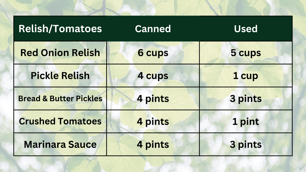 I really enjoy the red onion relish and am planning to make more of that soon. The pickle relish is good but I haven’t been going through it very fast, so I might need to go down to 4oz jars for that in the future. The bread and butter pickles are very good and I’m down to my last jar, so I’ll be making those again soon.